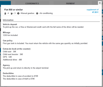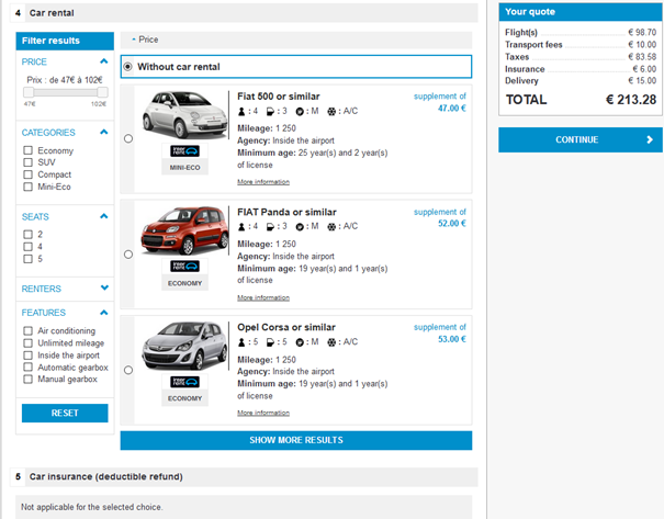 Sur le processus de réservation, ces prestations apparaissent dans une nouvelle section dédiée avec, de la même manière que pour les vols, un système de filtres permettant d’affiner sa recherche. Juste en dessous du choix de la voiture, une section propose de choisir une assurance pour la voiture, correspondant au remboursement de la franchise.