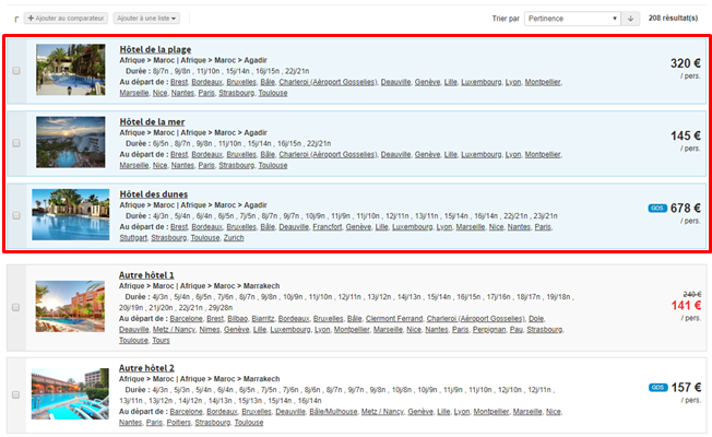 Par exemple, vous pouvez mettre en avant une exclusivité avec un excellent rapport qualité-prix sur une destination, et faire en sorte que celle-ci apparaisse dans les premiers résultats des recherches même si celle-ci a un prix d’appel supérieur aux premiers résultats de la recherche.