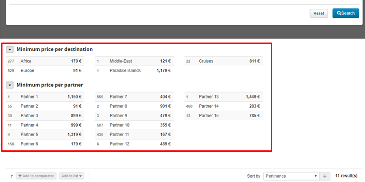 Sur le B2B, les chargements des blocs « Prix Minimum » permettent d’afficher les prix minimums par destination et les prix minimums par partenaire. Ils se chargent désormais de façon asynchrone afin d’améliorer les temps de chargement et la réactivité du B2B. Chaque bloc apparaît minimisé dans un premier temps avec une animation indiquant son chargement en cours si le bloc est défini comme ouvert par défaut. Dés que les requêtes sont effectuées et reçues par le navigateur client, le bloc s’ouvre et les résultats s’affichent.