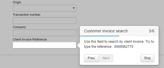 En 16.6, un tutoriel est déjà disponible. Il présente la fonctionnalité de recherche par numéro de facture client et guide pas à pas l’utilisateur jusqu’au champ de recherche, lui propose un numéro de facture à rechercher et lui montre où trouver le résultat.