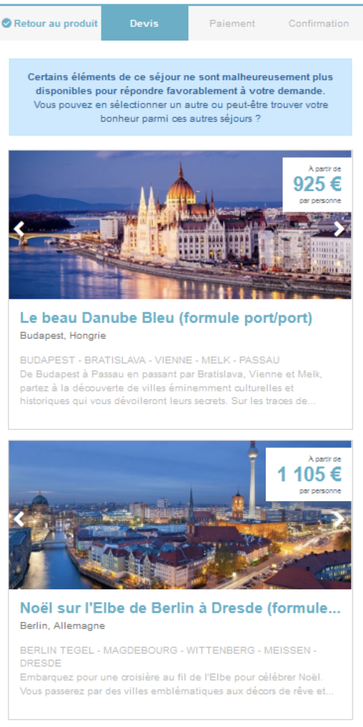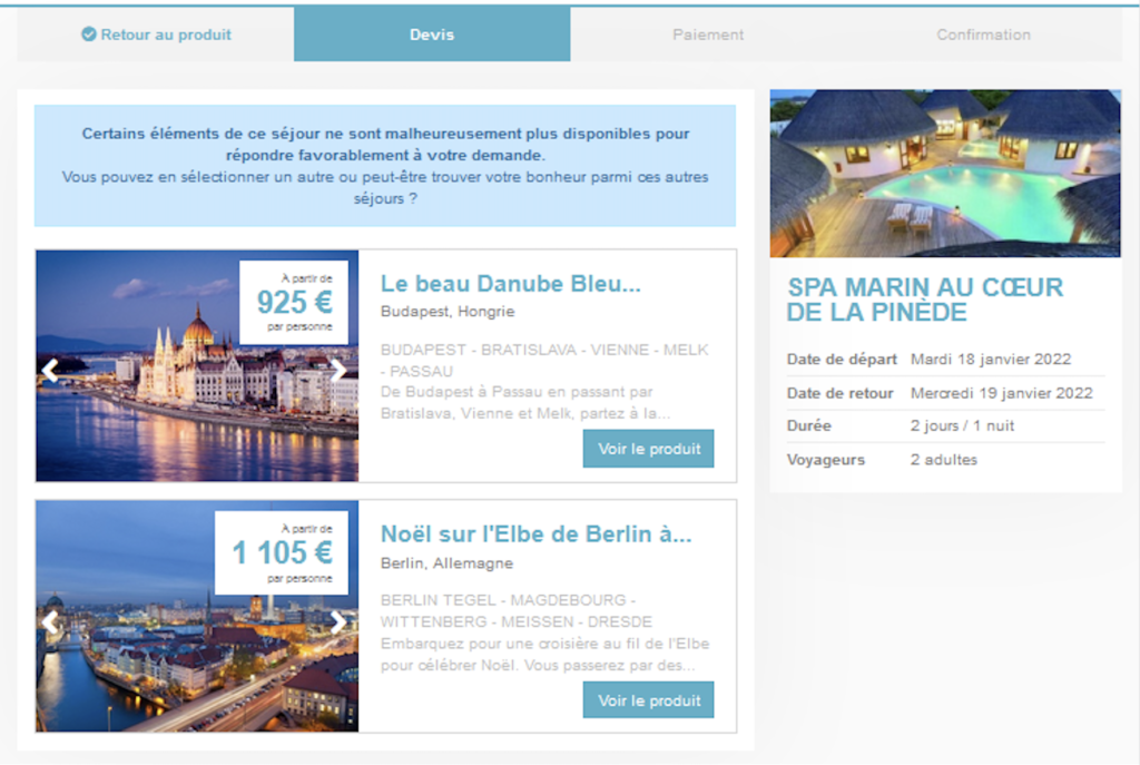 Il en résulte un « KO » au moment du passage au processus de réservation, qui n’est pas en mesure de satisfaire la demande client du fait de l’indisponibilité du produit (ou d’un élément du produit) sélectionné.