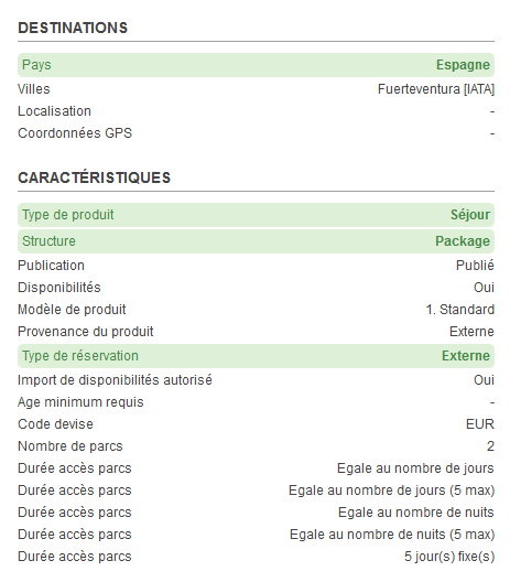 Ces informations sont visibles par tous sur la fiche produit mais sont configurables seulement par les personnes qui ont le droit « PRODUITS – Gérer les informations parcs ».