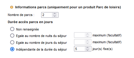 Il est possible de configurer les informations parcs à la création, à la duplication et à la modification d’un produit sur l’outil d’administration.
