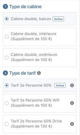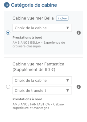 Il est possible de choisir le type de cabine sur le catalogue (Intérieure, extérieure, balcon, etc.). Dans ce cas, le processus de réservation affiche les propositions supérieure au égale au type de cabine pré-sélectionné (standard, suite, supérieure etc.).