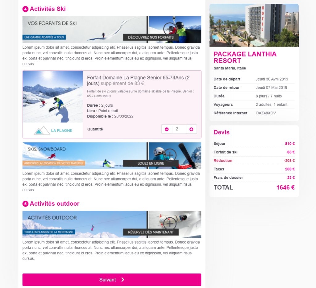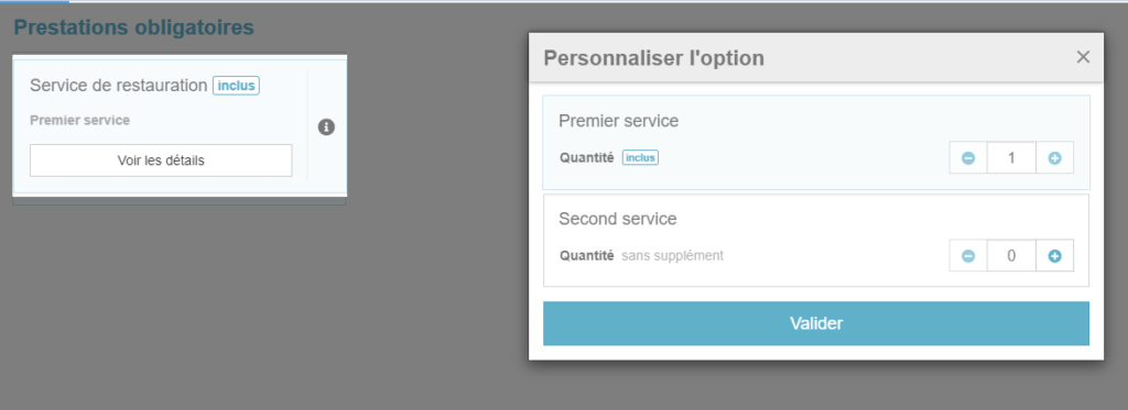 Suite à leur sélection, les prestations apparaissent sous l’image et le descriptif de la catégorie avec le détail des choix effectués à l’étape précédente (nombre de participants ou de service, date, langue, etc.)