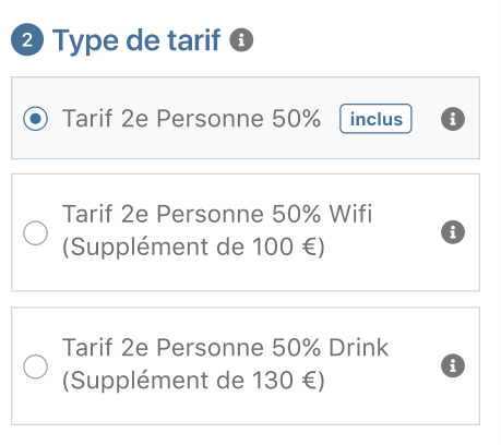 Type de tarif (peut correspondre aussi à un type de prestation : accès wifi par exemple)
