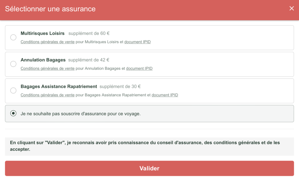 Fenête modale de proposition de l’assurance et de validation des conditions générales de ventes
