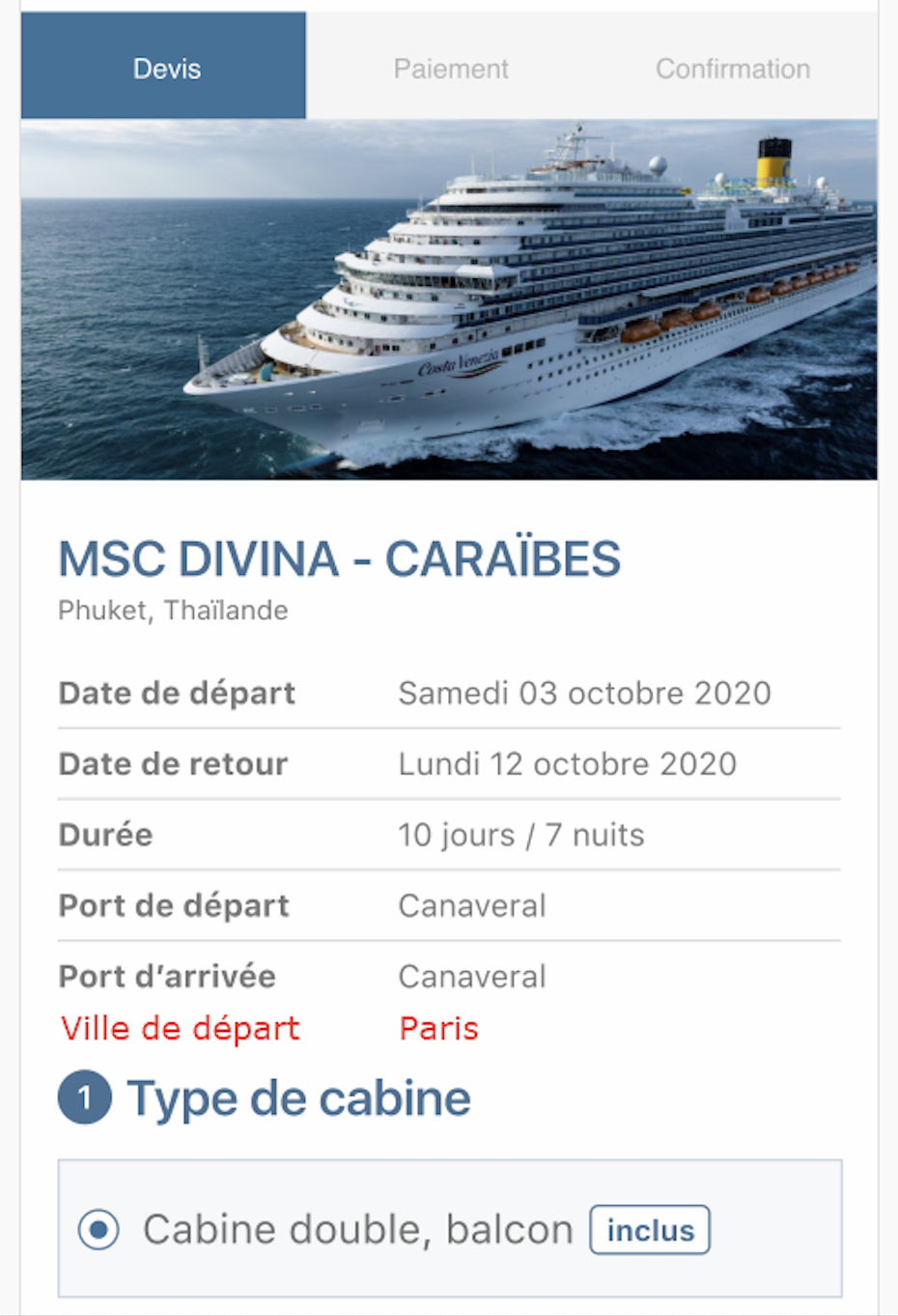 Enfin, juste avant la confirmation, la page récapitulative reprend l’ensemble des informations définies ci-dessous et adapté à un produit de type croisière.