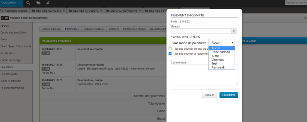 Il est désormais possible de définir dans le backoffice des types de paiements « En compte » afin d’indiquer le moyen de paiement lié aux paiement saisis.