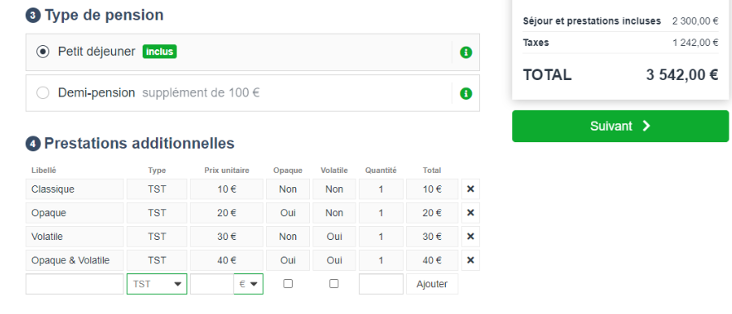 - Une volatilité : Une prestation volatile est une prestation qui n’est pas envoyée au distributeur. Elle apparait en page de devis pour être montrée au client mais disparait au moment de la réservation effective par l’agent de voyage chez le distributeur pour qu’elle ne soit pas envoyée au distributeur.