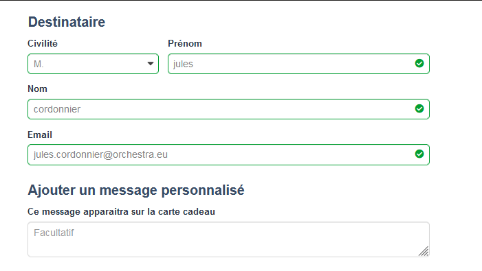 Lors de l’achat d’une e-carte cadeau, un code automatique est généré et envoyé par email au client, qui peut ensuite l’offrir au bénéficiaire de son choix, en ajoutant un message personnalisé.