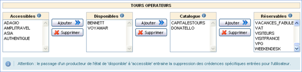 Concernant la gestion de la politique et des crédences, de manière générale, les droits d’un utilisateur déplacé sont toujours un sous-ensemble des droits de son nouvel utilisateur père. Par exemple pour la politique voyage, si, avant déplacement, un agent pouvait vendre les produits de Look Voyage, Amplitravel et Thalasso n°1 et que, après déplacement, son nouveau père n’autorise la vente que des produits d’Amplitravel et Thalasso n°1, le droit de vendre des produits Look Voyage lui sera retiré automatiquement.