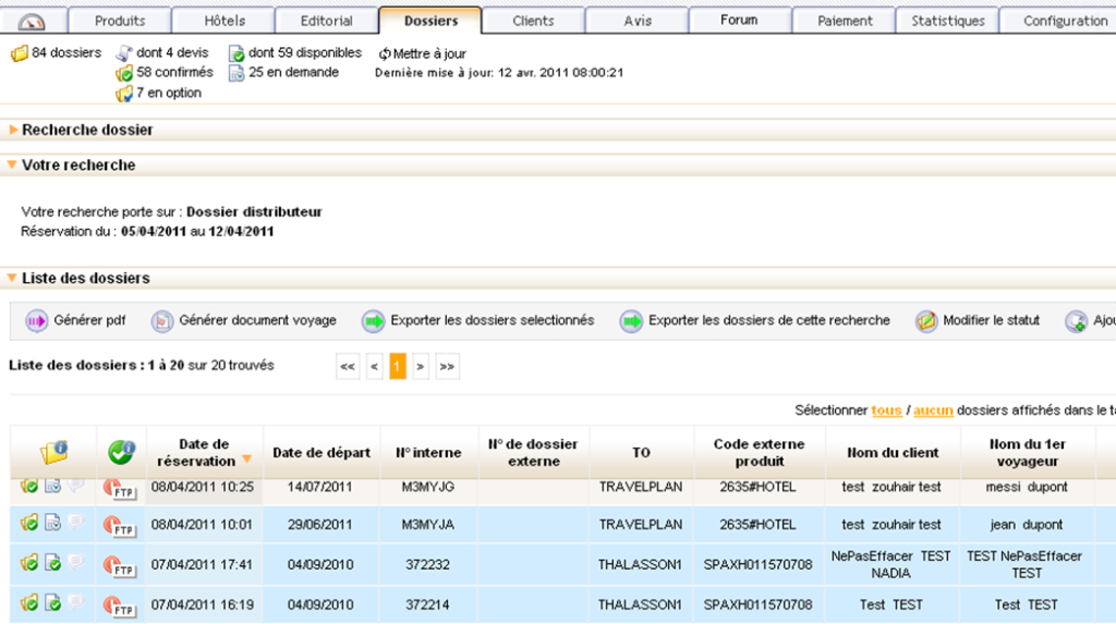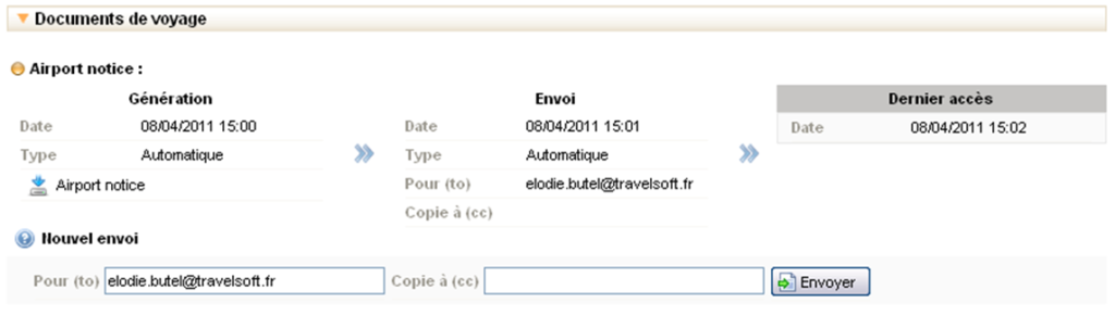Une fois que la convocation d’un dossier est récupérée, elle est envoyée automatiquement au client et/ou à l’agence en fonction du paramétrage établi. Une nouvelle zone ‘Documents de voyages’ s’ajoute au dossier où il est possible de consulter l’état de la convocation avec la date de génération, d’envoi et de dernier accès.