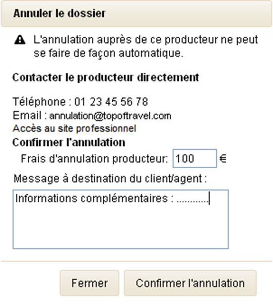 Dans ce cas de figure, un message est affiché indiquant que le producteur ne gère pas l’annulation automatique et qu’il est possible d’annuler directement par téléphone ou par mail avec affichage des informations producteur paramétrées ou via le B2B du producteur en affichant le lien vers le B2B (connexion SSO). Une fois l’annulation faite auprès du producteur, il est possible d’indiquer les frais d’annulation et un mail d’annulation est envoyé automatiquement au client et/ou à l’agent en fonction du paramétrage.