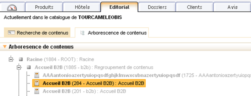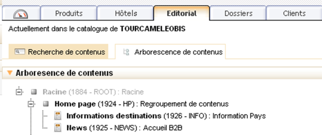 Un nouveau module de gestion de contenu a été mis en place dans l’onglet ‘Editorial’. Ce module permet notamment d’ordonner vos contenus transverses dans une arborescence. De nouveaux sous-onglets apparaissent donc : l’un pour accéder au moteur habituel de recherche des contenus et l’autre pour accéder à l’arborescence des contenus.