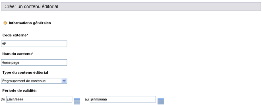 Il est possible de créer des contenus qui permettent de regrouper plusieurs contenus. Par exemple, il est possible de créer un niveau de regroupement ‘Home page’ et de mettre en ‘fils’ dans l’arborescence les contenus qui apparaissent sur la Home page. Pour créer un contenu de ce type, il faut choisir le type ‘Regroupement de contenu’ dans la pop-up de création.