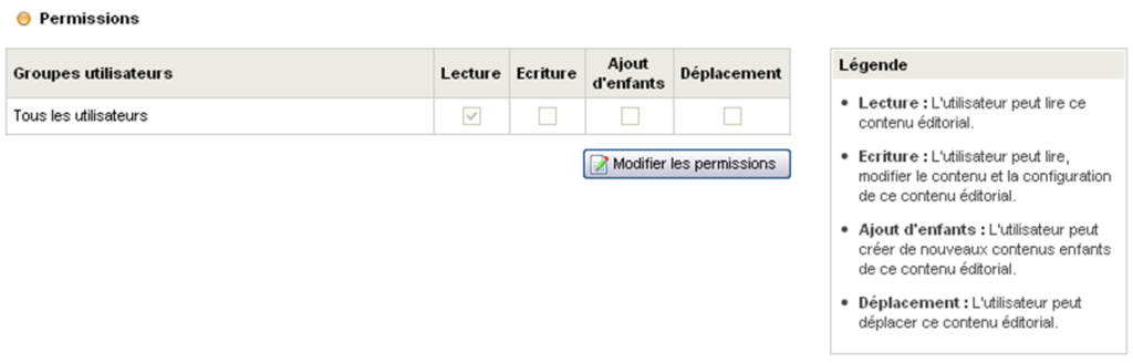 Dans la pop-up de création de contenu, une zone ‘Permissions’ est ajoutée. Elle permet de définir des droits sur les contenus créés : droit de lecture, d’écriture (modification), d’ajout de contenu ‘fils’, de déplacement de contenu dans l’arborescence. Ces droits peuvent être définis par contenu et par groupe d’utilisateurs au niveau de l’outil d’administration. Cette gestion de droit peut également être utilisée en front office (après modifications au niveau de l’intégration du site).