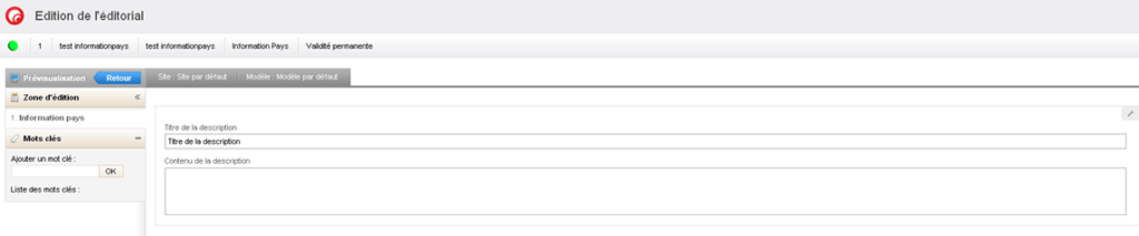 La modification des contenus éditoriaux est désormais faite dans le nouveau module de gestion de contenu. Ce module de gestion de contenu est basé sur une nouvelle application plus performante et plus ergonomique. Celui-ci s’ouvre dans une nouvelle fenêtre lors du click sur l’action ‘modifier’.