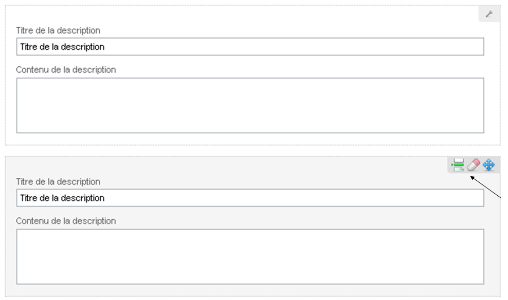 Sur chaque zone définie dans le format du contenu transverse, une boite à outil est disponible permettant l’ajout, la suppression ou le déplacement d’un bloc.