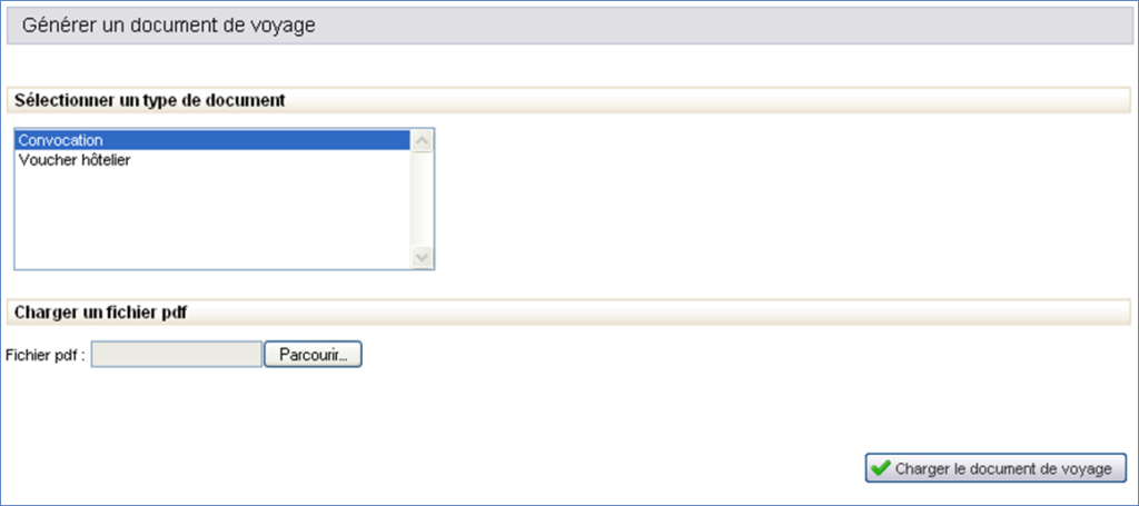 Il est désormais possible dans la gestion des documents de voyage de charger un fichier pdf qui aurait été transmis préalablement par le producteur. Cela permet ainsi le stockage de tous les documents au niveau de l’outil d’administration quelque soit le producteur. L’envoi automatique au client peut ainsi être également géré par l’outil d’administration.
